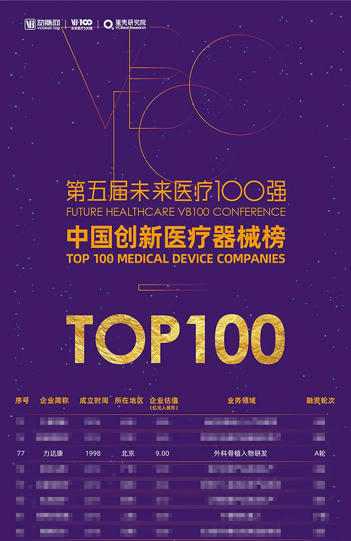 日前,医疗领域专业服务机构及媒体动脉网与蛋壳研究院联合揭晓了《2020-2021年未来医疗100强系列榜单》,力达康成功入选并荣登中国创新医疗器械榜TOP100。
